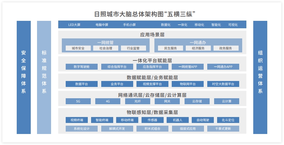 日照城市大脑运行管理中心,是集科普展示、数据汇聚分析、运行指挥联动等功能于一体的综合性场所,位于日照国际博览中心F区,包括日照智慧城市科普体验中心、运行中心和运行保障中心。日照城市大脑平台,通过业务系统打通融合、基础数据资源共享,为全市数字政府建设提供视频监控、物联感知及时空信息等资源,高效赋能应用场景。日照城市大脑采用五横三纵架构,夯实云、网、端城市支撑底座,建设数据、业务、一体化赋能系统。