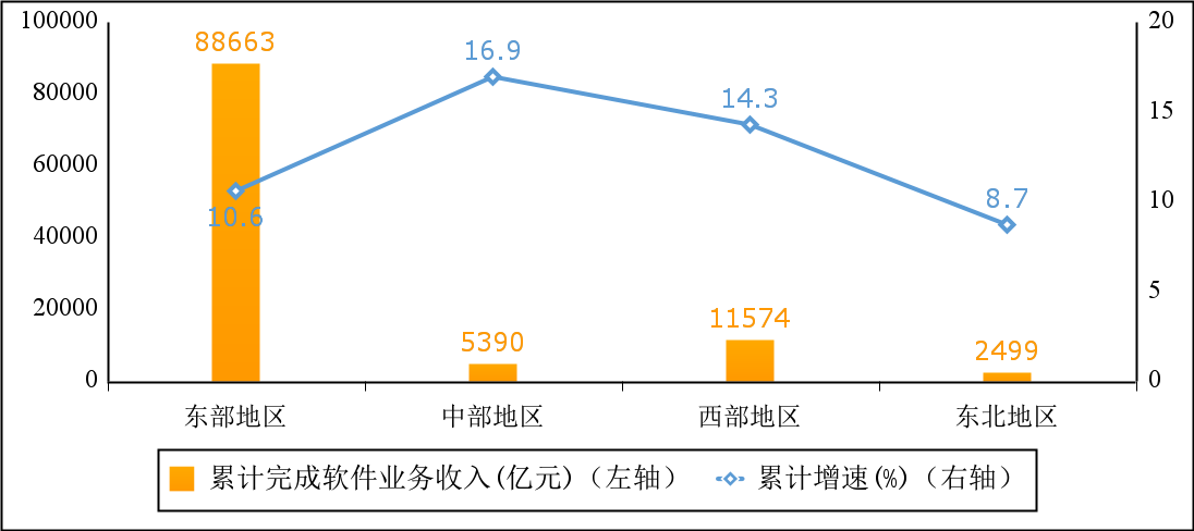 东部地区保持较快增长,中、西部地区增势突出。2022年,东部、中部、西部和东北地区分别完成软件业务收入88663亿元、5390亿元、11574亿元和2499亿元,分别同比增长10.6%、16.9%、14.3%和8.7%。其中,中部、西部地区高出全国平均水平5.7、3.1个百分点。四个地区软件业务收入在全国总收入中的占比分别为82.0%、5.0%、10.7%和2.3%。