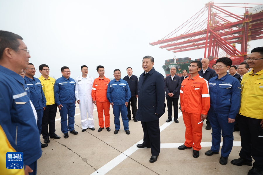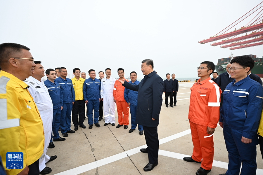 5月22日至24日,中共中央总书记、国家主席、中央军委主席习近平在山东考察。这是22日下午,习近平在日照港亲切慰问港口科技工作者、运营人员、航运人员。新华社记者谢环驰摄